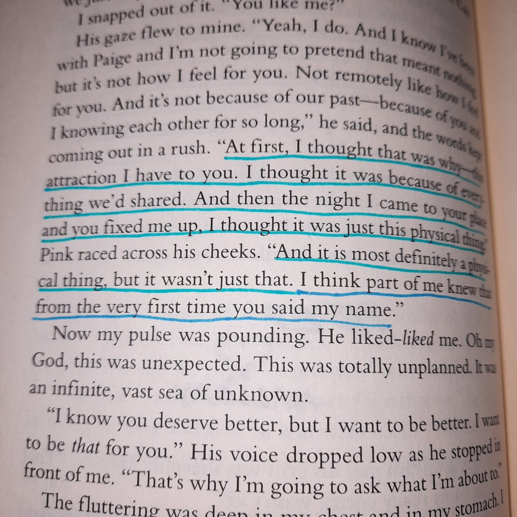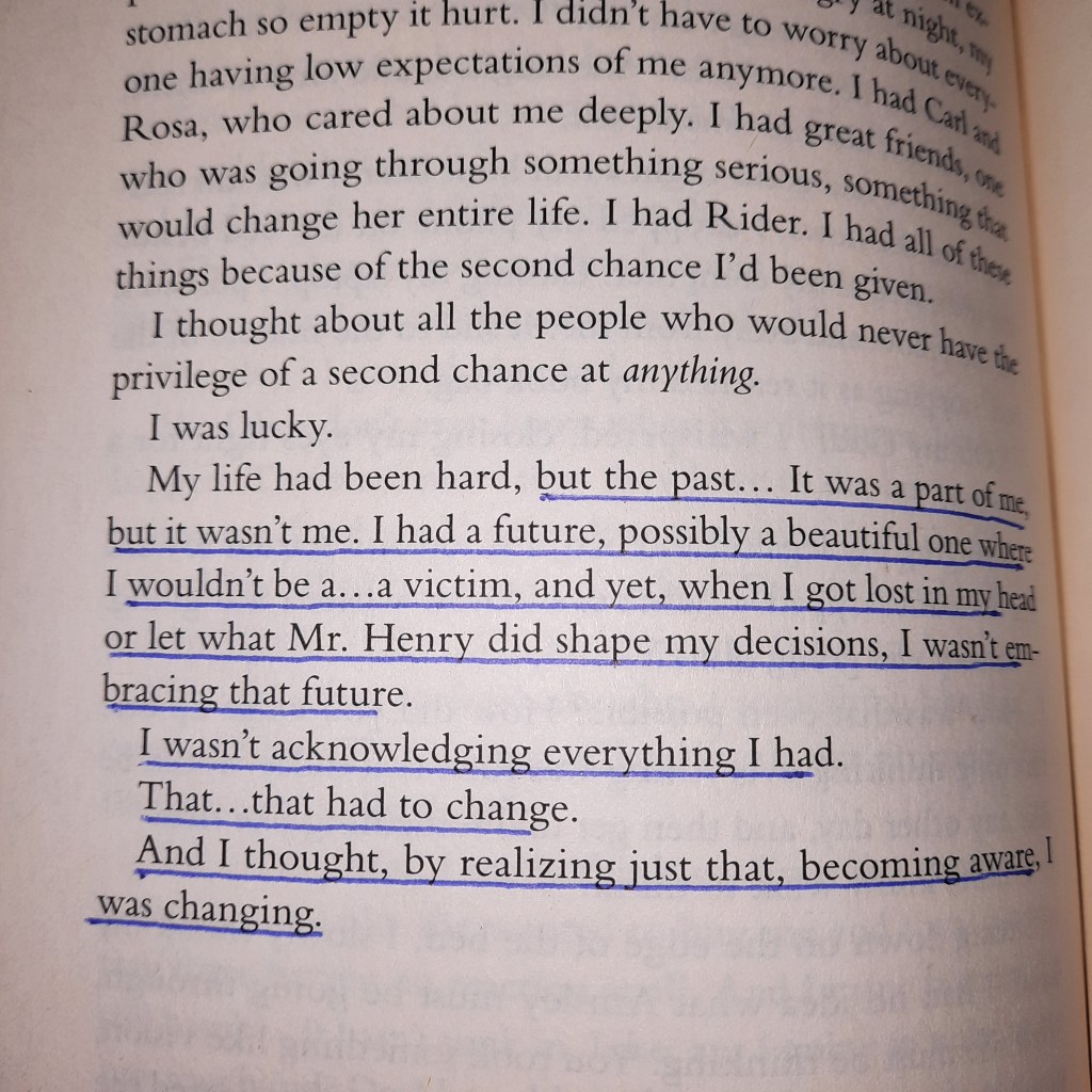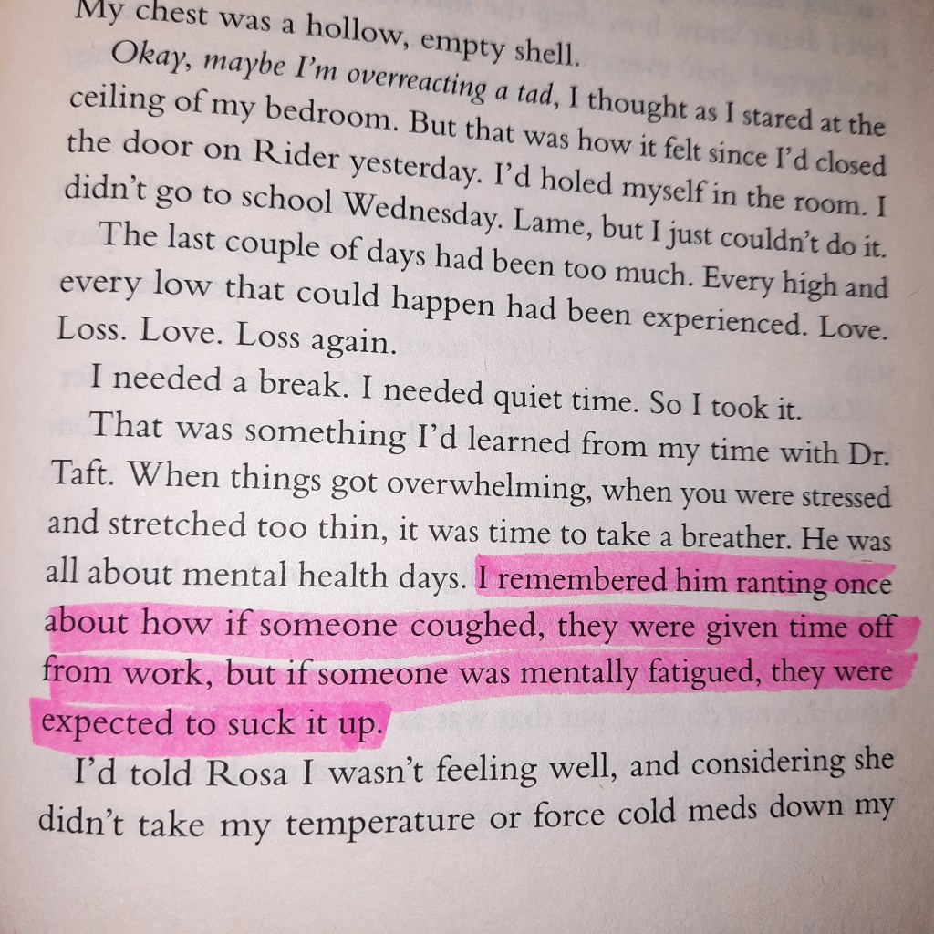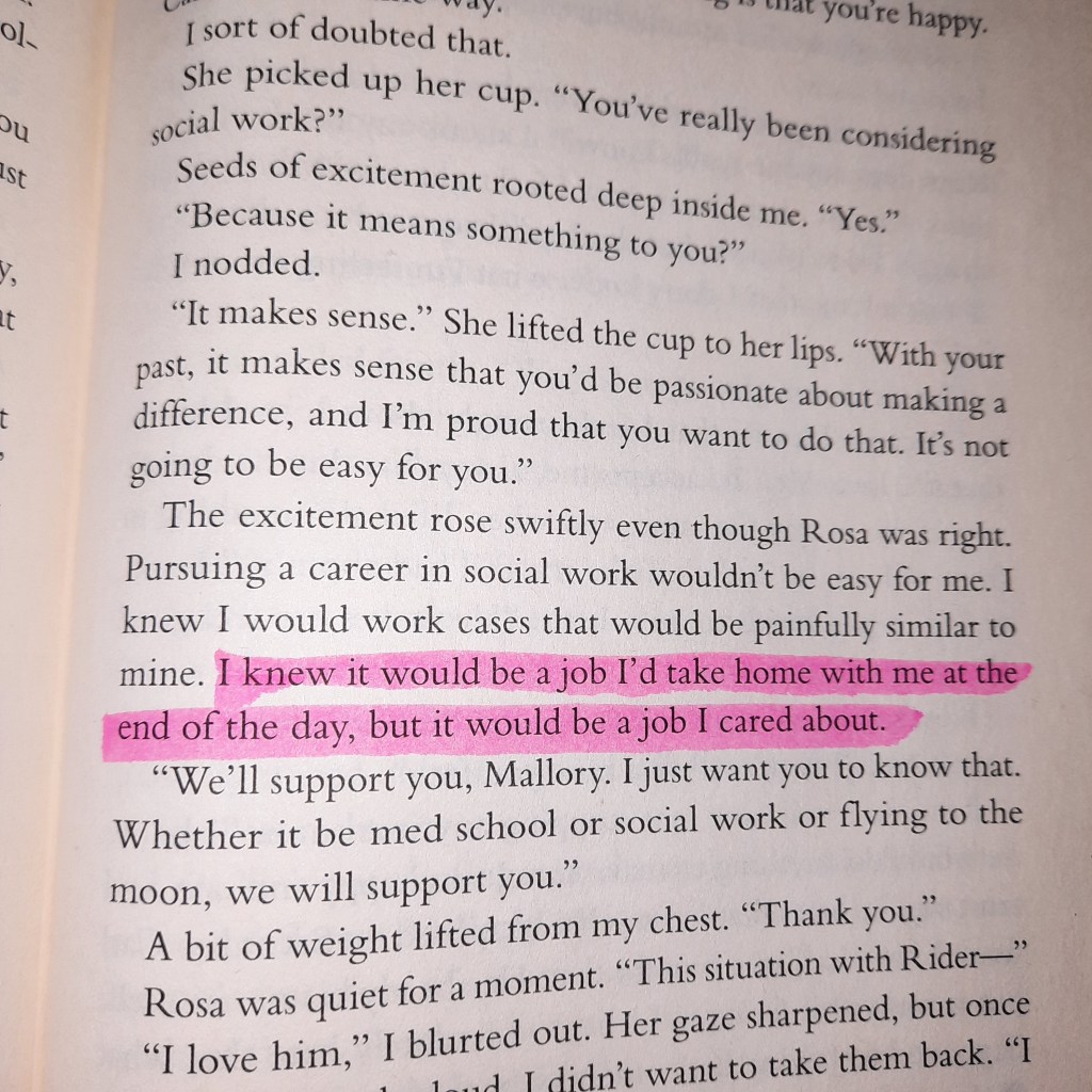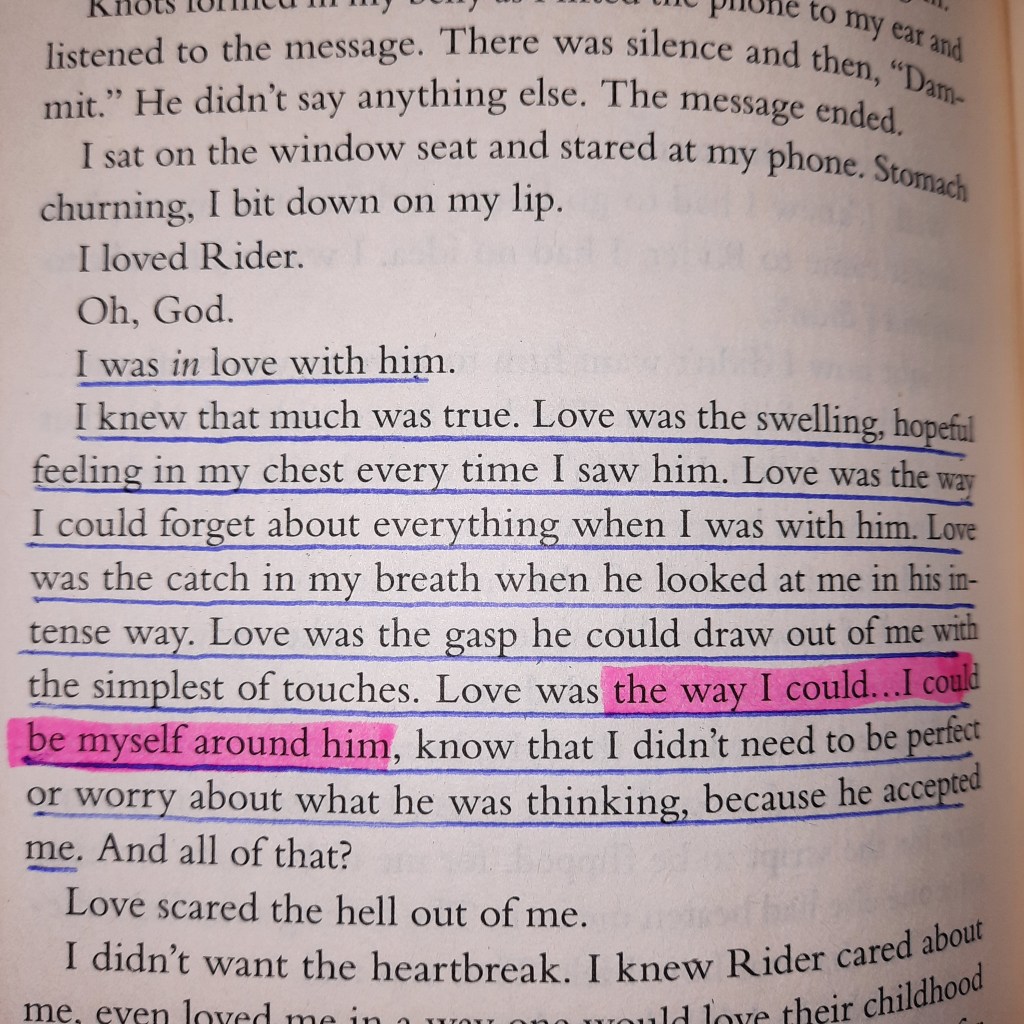 Actually, there is one more quote I wrote down in my little quote book back then, but forgot to highlight it. I couldn’t find the page now but the quote goes: “We’ve been separated. But we had never really been apart.” I love this one very much, but my favourite of all thirteen quotes is the one where Mallory is holding Rider. “Then it was me who put Rider back together.” For me, it resembles perfectly the reciprocity of true love. Mallory had grown through her time with Rider and now she helped him with the feelings he was hurting about. It shows how strong love can make you and also how vulnerable it allows you to be in front of another person who understands you like nobody else. The quote reminded me of the quote by Rainer Maria Rilke going something like “That’s what love is about. That two lonely people protect each other and talk with each other.”