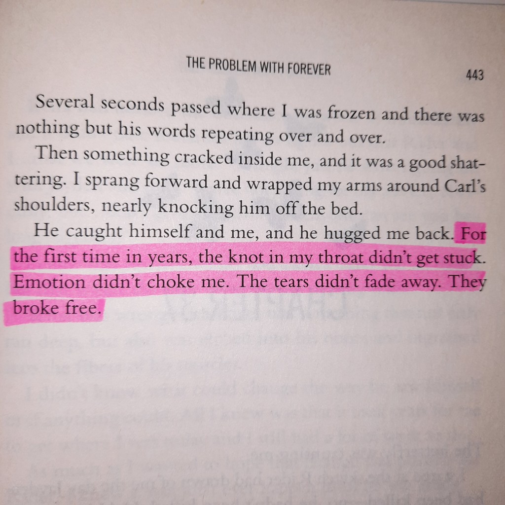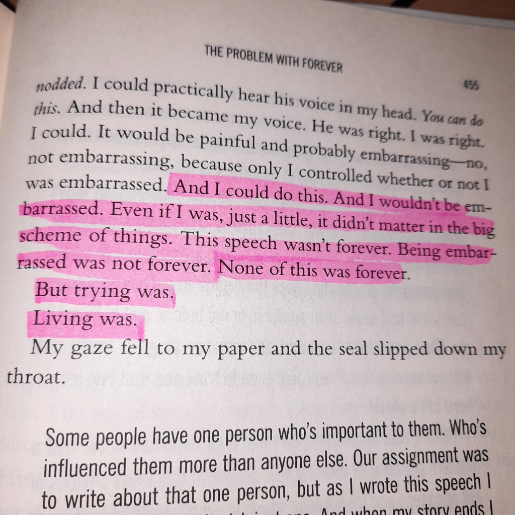 I am a person that likes to plan ahead. Next week I want to write about a quote from “The Problem With Forever” by Jennifer L. Armentrout and take a look at performance anxiety. So I thought: Why not share a few of my favourite quotes from the book as a preface today? Because of that, today’s post is a little bit shorter than usual, but I think the quotes speak for themselves. Every book that pictures mental health issues, sexuality or just every day topics in a real and authentic way, will be one that I keep very close in my heart. This one is definitely one of them. When I look at the German title for Armentrout’s book (“Tomorrow I’ll love you forever”), I much prefer the English title because it doesn’t give the image that it is “all about the love story”. I mean, it’s a pretty important part of the story and it is what makes Mallory grow in many ways, but it isn’t all about that. Her inner journey was even more beautiful.
